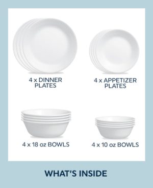 Be the first to review “Corelle® Winter Frost White 16-piece Mugless Dinnerware Set. Service for 4” Cancel reply